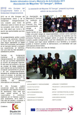 En los próximos días se procederá al reparto de la revista informativa y memoria del ejercicio 2011, en la cual podréis disponer de información de los programas y actividades del proyecto de envejecimiento activo del pasado año al igual que algunos documentos de interés para los mayores. Con este número publicado, la asociación cumple un doble objetivo informar a sus socios y realizar una actividad educativa formativa. La revista ha sido subvencionada en su totalidad por la diputación de Córdoba y se encuentra dentro del nuestro proyecto de envejecimiento activo para 2012.